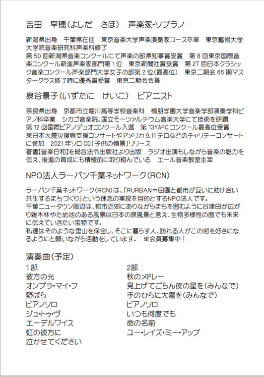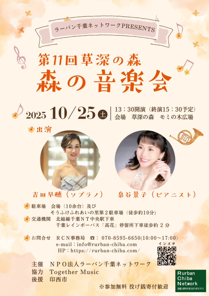10/25(土)第11回森の音楽会開催 2025年9月20日 最終更新日時 : 2025年9月20日 rcnweb 11回目の森の中の音楽会。素敵な歌声とピアノの調べに癒されに来て下さい。当日はお馴染みの森のカフェもオープン!自家焙煎のコーヒーもお楽しみ下さい秋の森の散策もいいですね!日時 10月25日(土) 13:30開演 15:30終演予定 Follow me! FacebooktwitterHatenaPocket
